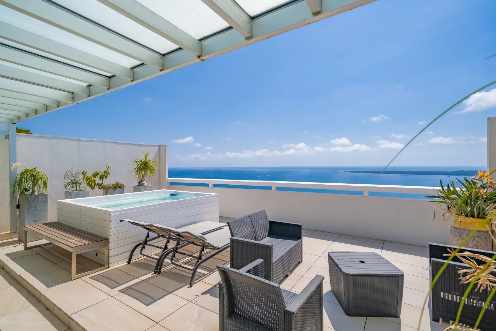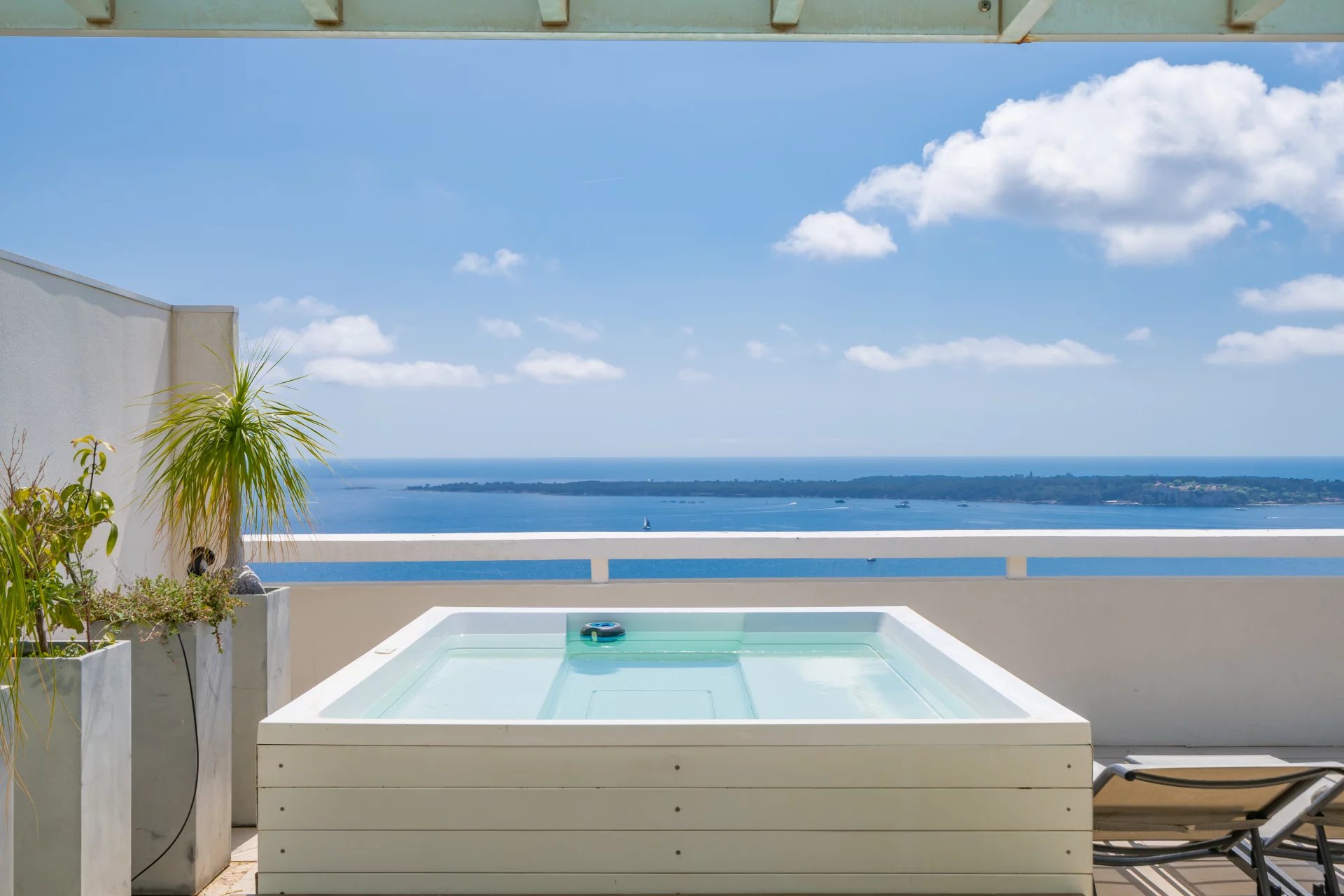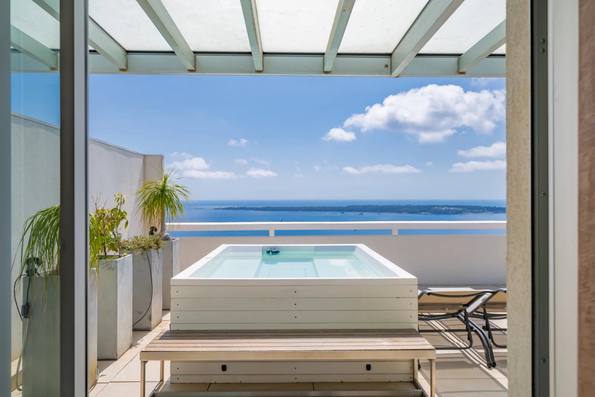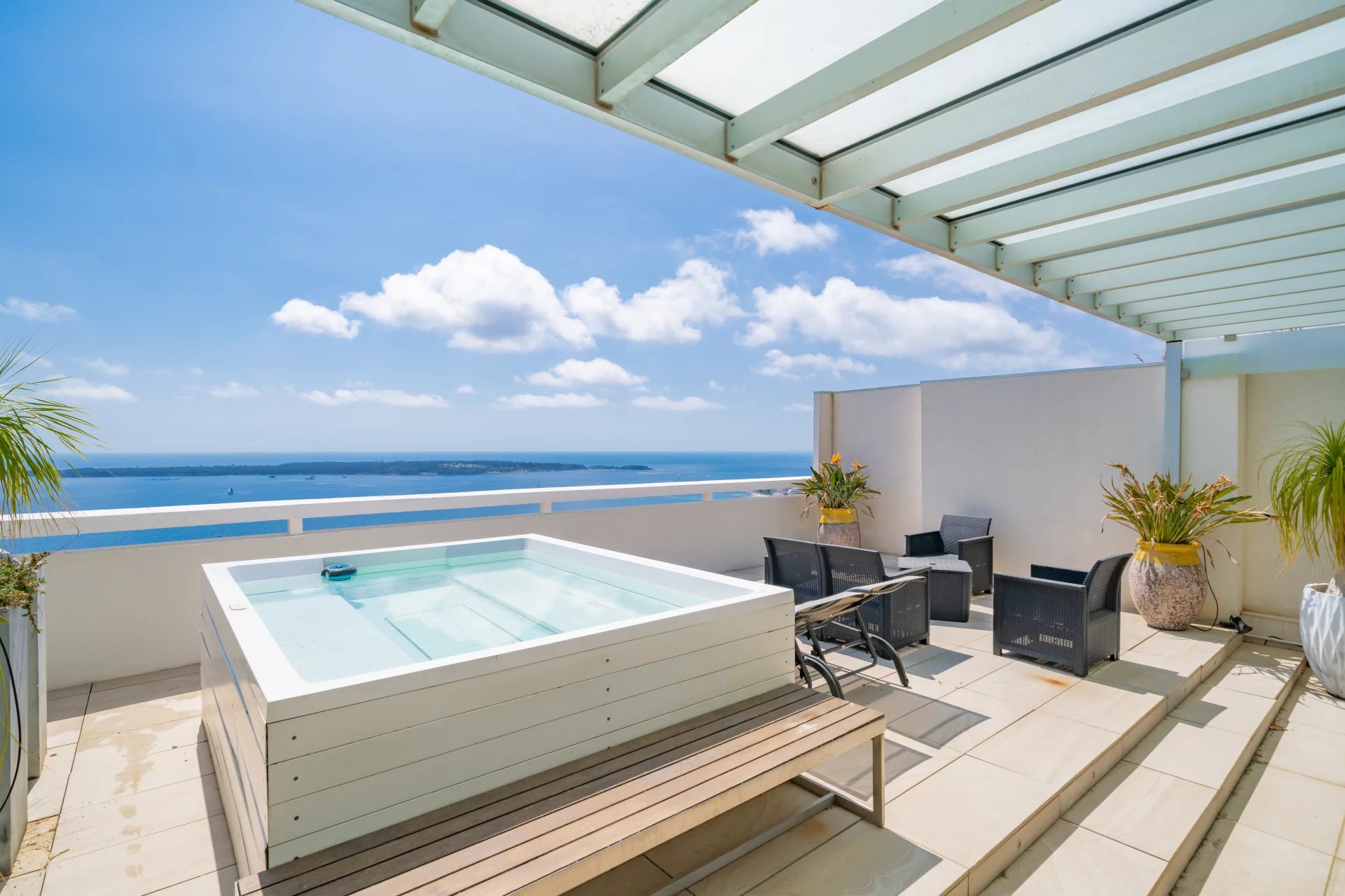 on the upper level, a spectacular second terrace provides an exceptional outdoor living space with a private Jacuzzi and magnificent sea views , the perfect setting to relax, entertain, and enjoy the Cannes lifestyle.