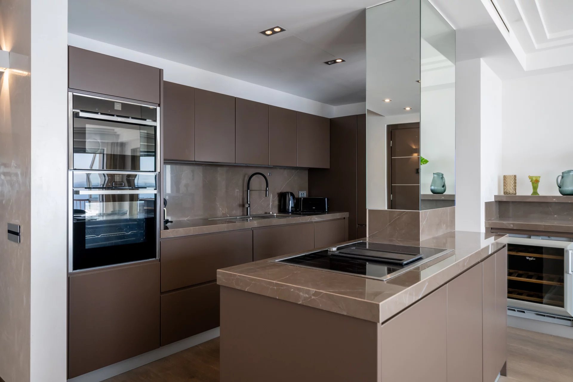 Spanning two levels, the property features a spacious double living room filled with natural light, opening onto a stunning Terrace with uninterrupted views over the Mediterranean Sea. The elegant open plan American Kitchen is fully equipped and perfectly integrated into the living area, creating an ideal space for entertaining and every day comfort.